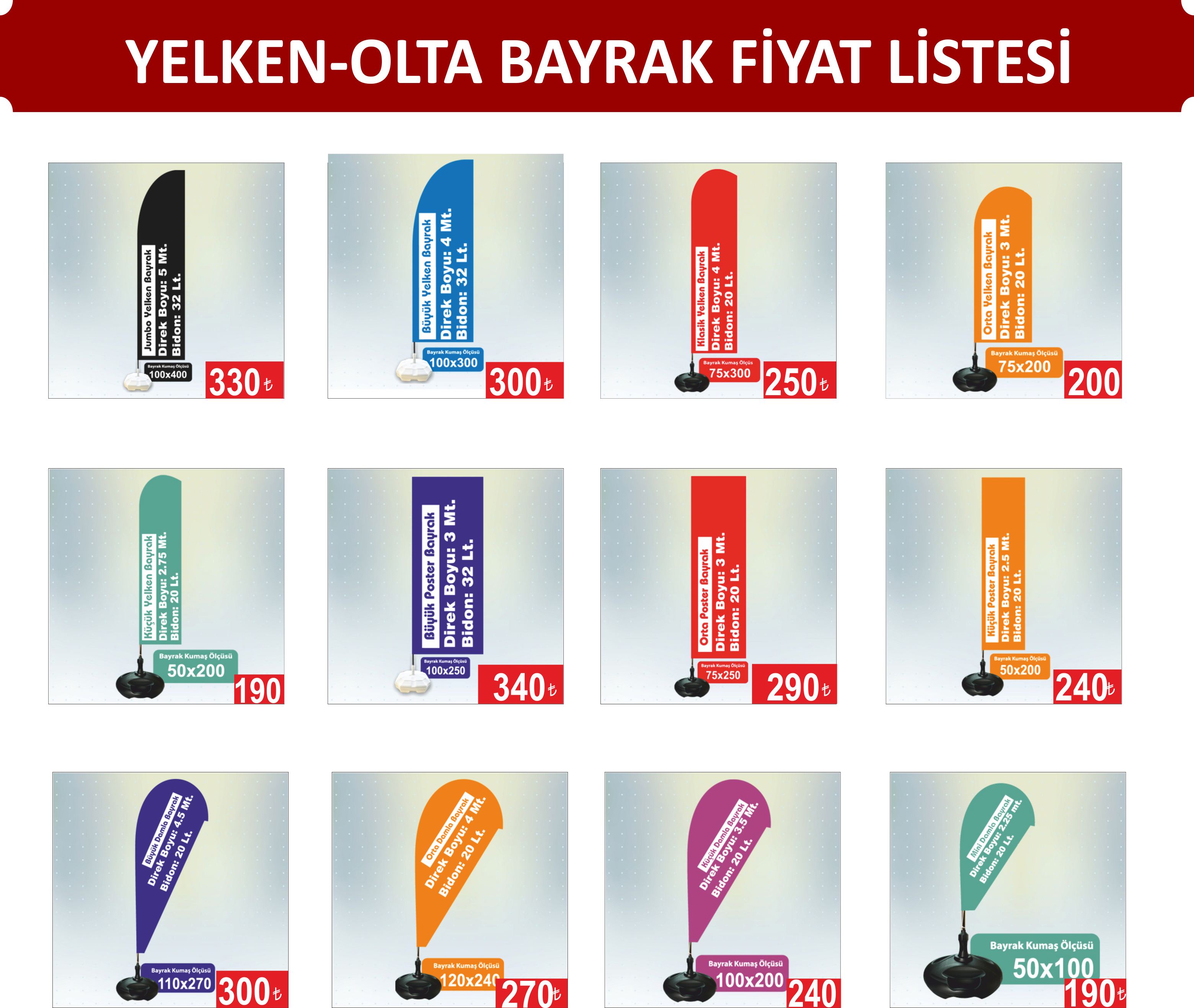 Olta bayrak kategorisi içinde Vertikal Bayrak, Japon Bayrak, Yelken Bayrak, Plaj Bayrak ve Damla Bayrak da bulunmaktadır. Talebe göre bu saydığımız tüm bayrak çeşitlerini üretebilmekteyiz